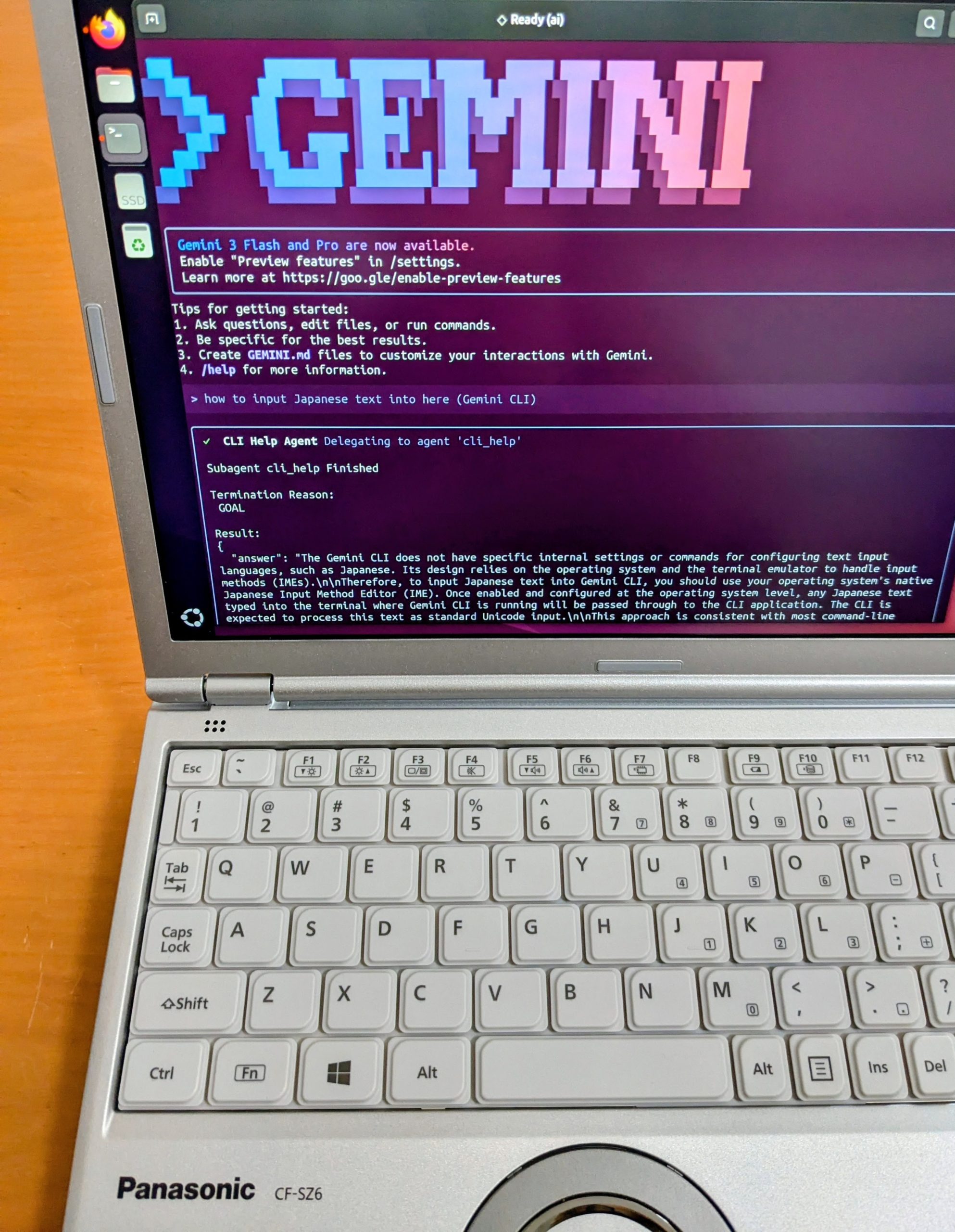 たとえばこのレッツノートは、数年前に未使用品を買って備蓄していたもので、発売はたぶん10年くらい前。バッテリーを自分で交換できるのがありがたい。OSはUbuntuにして、Gemini CLIをインストールしました。ターミナルで動くGeminiのインタフェイスですな。これで、最先端のコンピューティングパワーを古パソ(ふるぱそ)で享受することができるわけです。日本語入力が鬼門になりがちですが、わたくし的には、Mozcを入れてキーレイアウトを「ことえり」にするだけで、ほぼイケます。